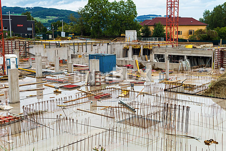 Beschreibung Win Wohnhaus wird gebaut. Arbeiten mit Beton für den Keller eines Hauses