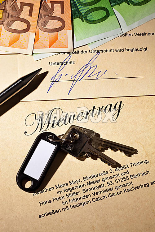 Beschreibung Der Schlüssel einer Wohnung und ein Mietvertrag in deutscher Sprache. Mit Eurogeld scheinen