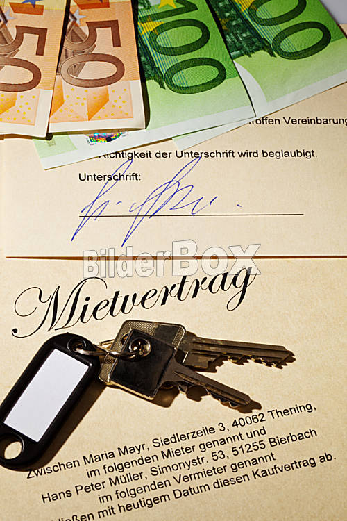 Beschreibung Der Schlüssel einer Wohnung und ein Mietvertrag in deutscher Sprache. Mit Eurogeld scheinen