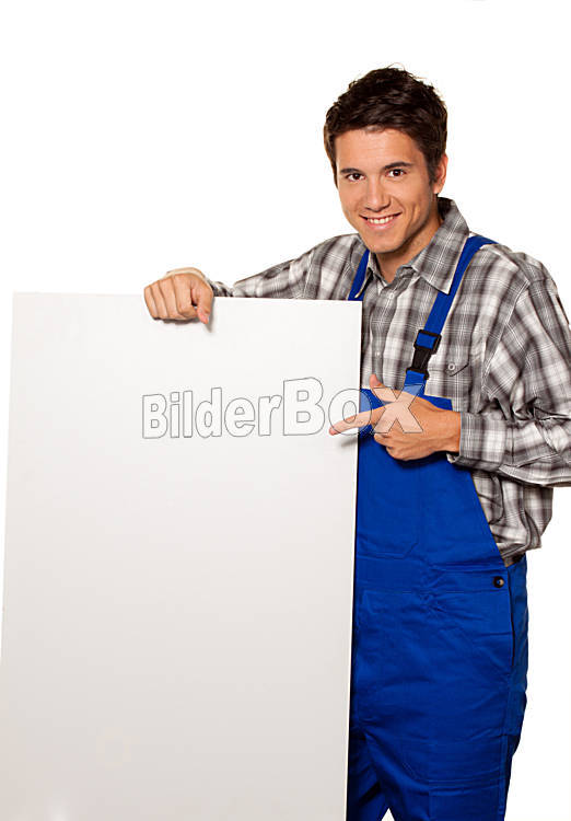 Beschreibung Junger Handwerker - Klemptner - Bauarbeiter vor weißem Hintergrund, Young craftsmen - plumbing - construction workers on a white background