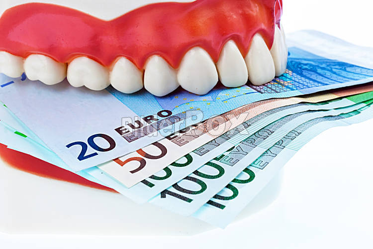 Beschreibung Ein Zahnmodell beim Zahnarzt mit Euroscheinen. Kosten für Gesundheit.