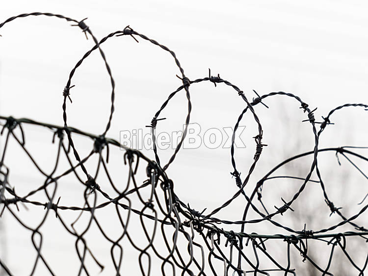 Beschreibung Ein Zaun ist mit Stacheldraht gesichert. Symbolfoto für Sicherheit, Gefängniss und Kriminalität.