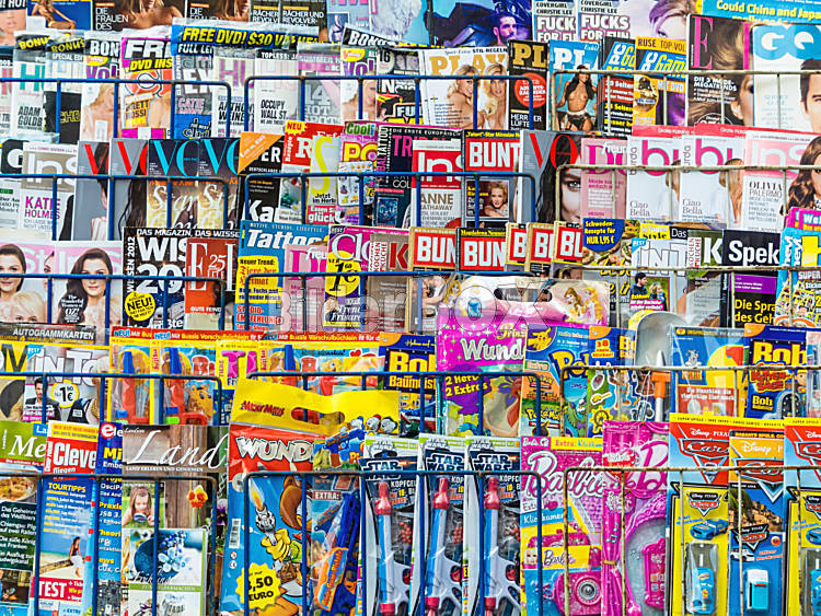 Beschreibung Zeitungen und Zeitschriften in einem Buchladen. Meinungsfreiheit und Pressefreiheit