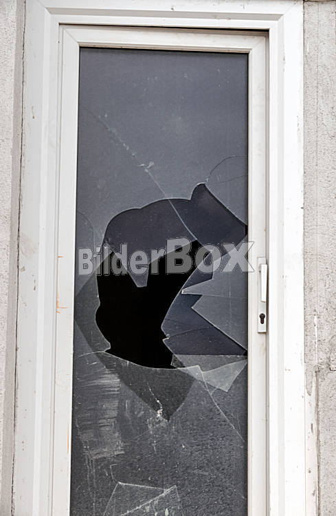 Beschreibung Eine zerbrochene Fensterscheibe auf einer Terrassentür