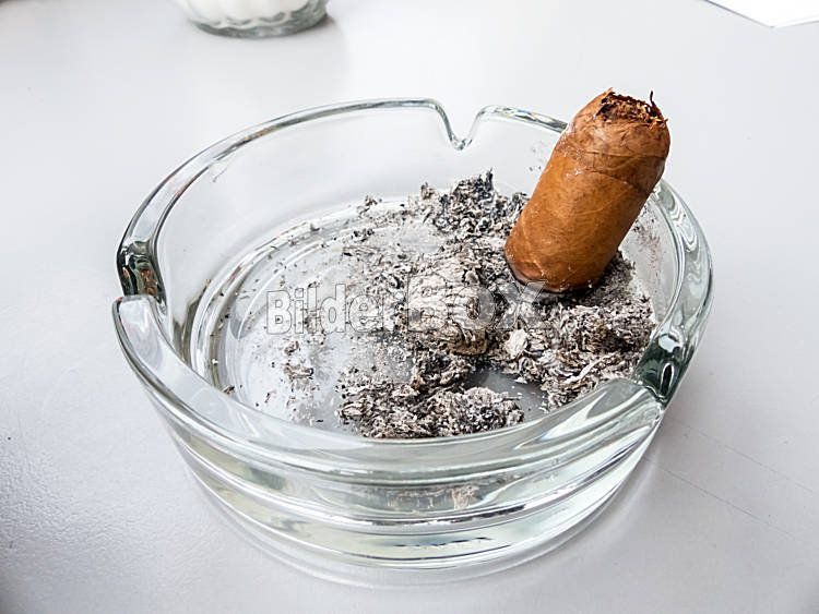 Beschreibung Eine fast fertig gerauchte Zigarre in einem Aschenbecher