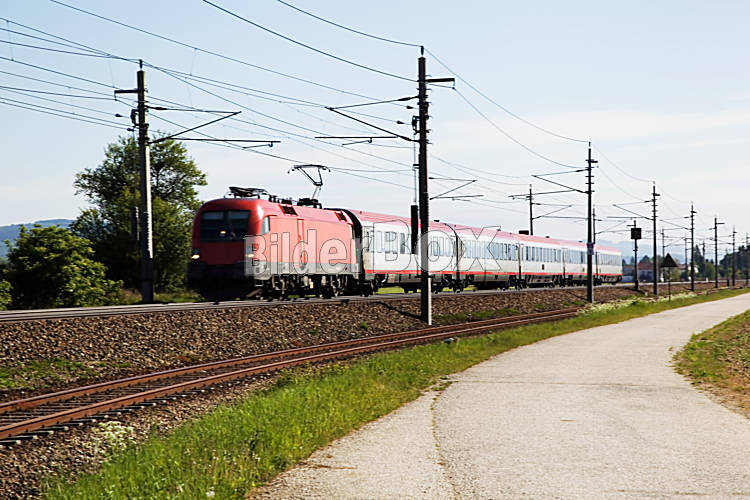 Beschreibung Ein Zug für Personen fährt auf Eisenbahnschienen