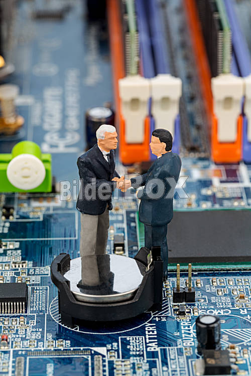 Beschreibung Zwei Manager auf Computerplatine, Symbolfoto für Computer, Anschaffung, Partnerschaft, B2B