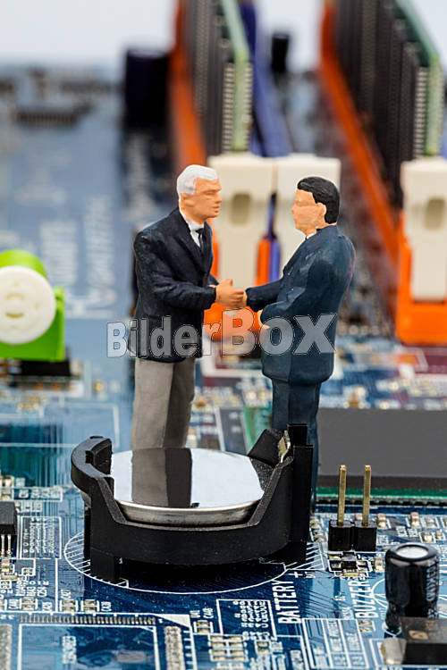 Beschreibung Zwei Manager auf Computerplatine, Symbolfoto für Computer, Anschaffung, Partnerschaft, B2B