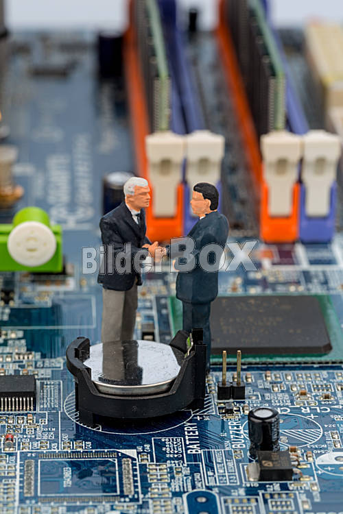 Beschreibung Zwei Manager auf Computerplatine, Symbolfoto für Computer, Anschaffung, Partnerschaft, B2B