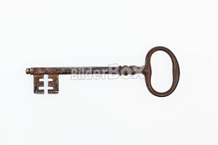 Beschreibung Ein alter Schlüssel liegt auf einem weißen Hintergrund
