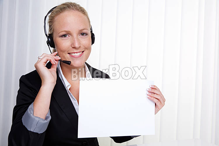 Beschreibung Eine freundliche junge Frau mit Headset im Kundendienst telefoniert mit einem Kunden. Freundliche Hotline Mitarbeiterin.