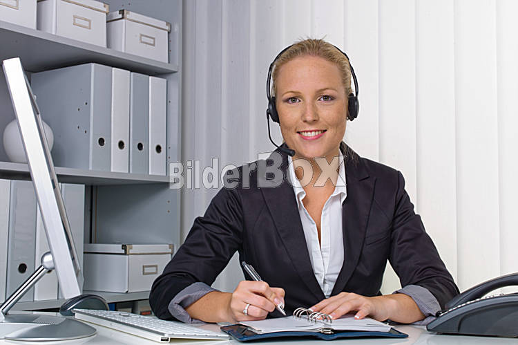 Beschreibung Eine freundliche junge Frau mit Headset im Kundendienst telefoniert mit einem Kunden. Freundliche Hotline Mitarbeiterin.