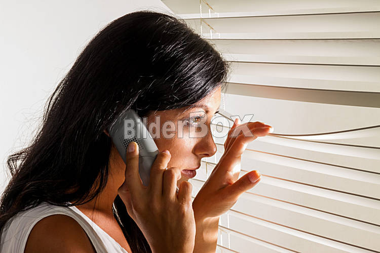 Beschreibung Eine junge Frau beobachtet etwas durch die Jalousie ihres Fensters