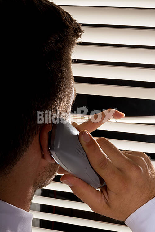 Beschreibung Eine junge Frau beobachtet etwas durch die Jalousie ihres Fensters