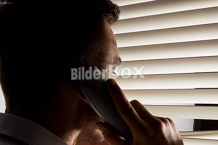 Beschreibung Eine junge Frau beobachtet etwas durch die Jalousie ihres Fensters