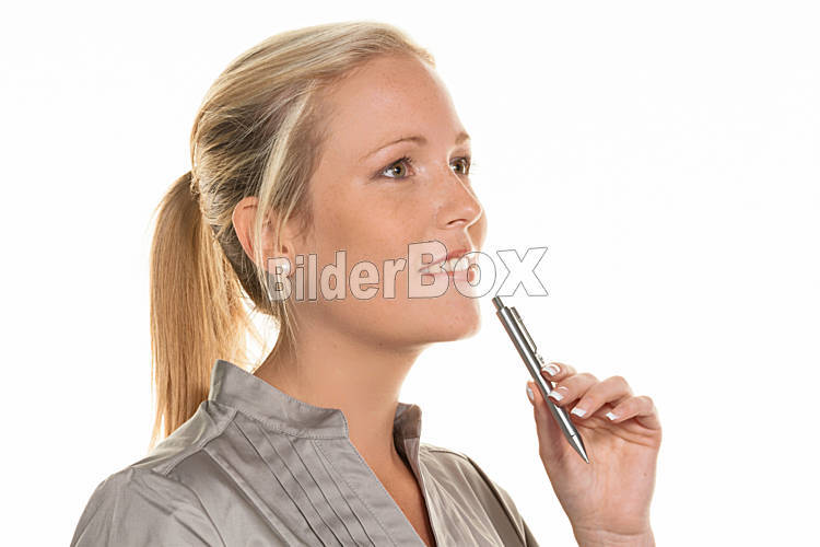 nachdenklicher Frau mit Kugelschreiber