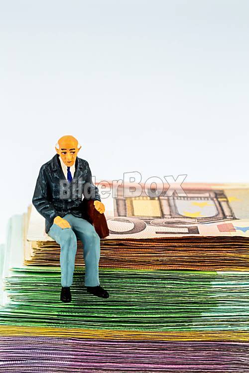 Beschreibung symbolic photo for retirement and old-age security, figure an old man sitting on a stack of bills
