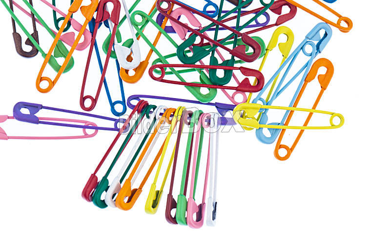 Beschreibung Viele bunte Sicherheitsnadel liegen auf einem weißen Hintergrund