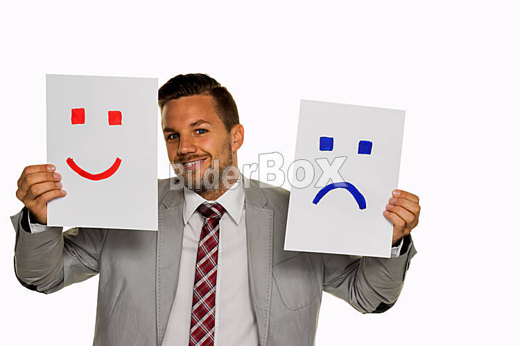 Beschreibung Ein Manager oder Unternehmer kann sich nicht entscheiden ob er weinen oder lachen soll