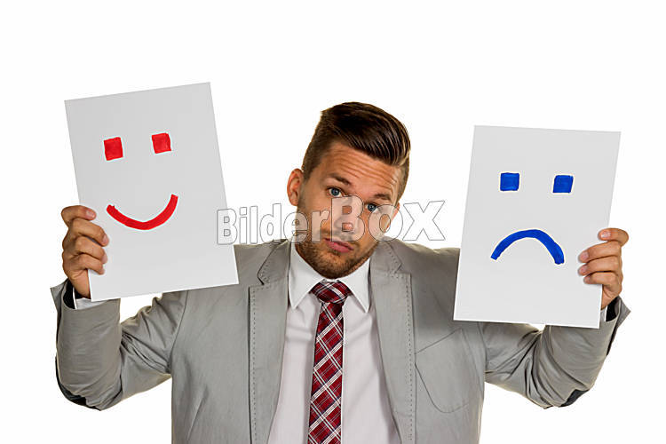 Beschreibung Ein Manager oder Unternehmer kann sich nicht entscheiden ob er weinen oder lachen soll